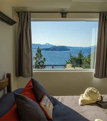 Dormitorio, cama doble, TV Smart 32", balcón-deck propio con vista al lago Nahuel Huapi.