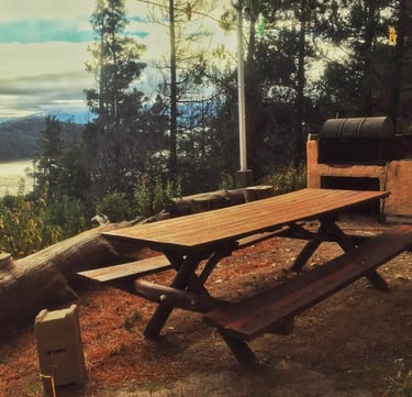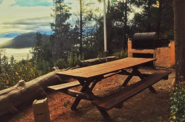 Planta Inferior: Living equipado con 2 sofá cama rebatibles, con cama carre debajo (en el que duermen 6 personas en total). Cocina, comedor, 1 baño con ducha, fondo con parrilla, mesa y bancos de madera, todo con vista al lago Nahuel Huapi.