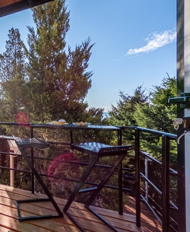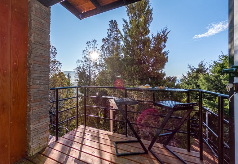 Balcón-deck propio con mesa y sillas, vista al lago Nahuel Huapi.